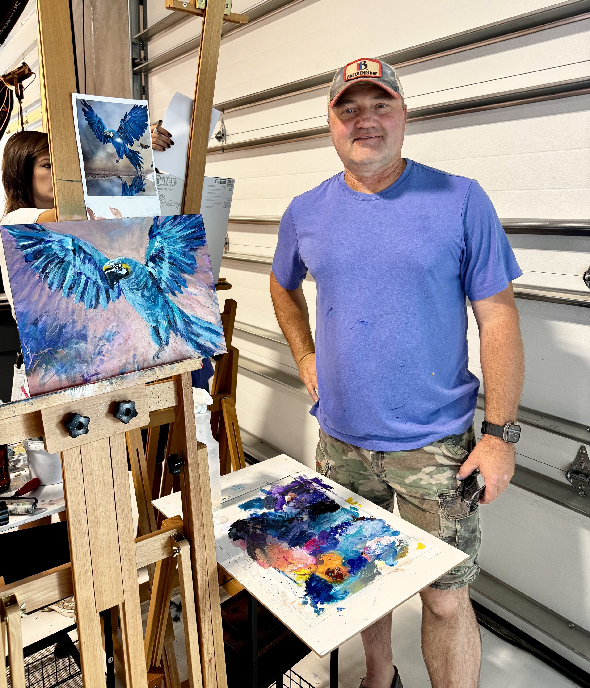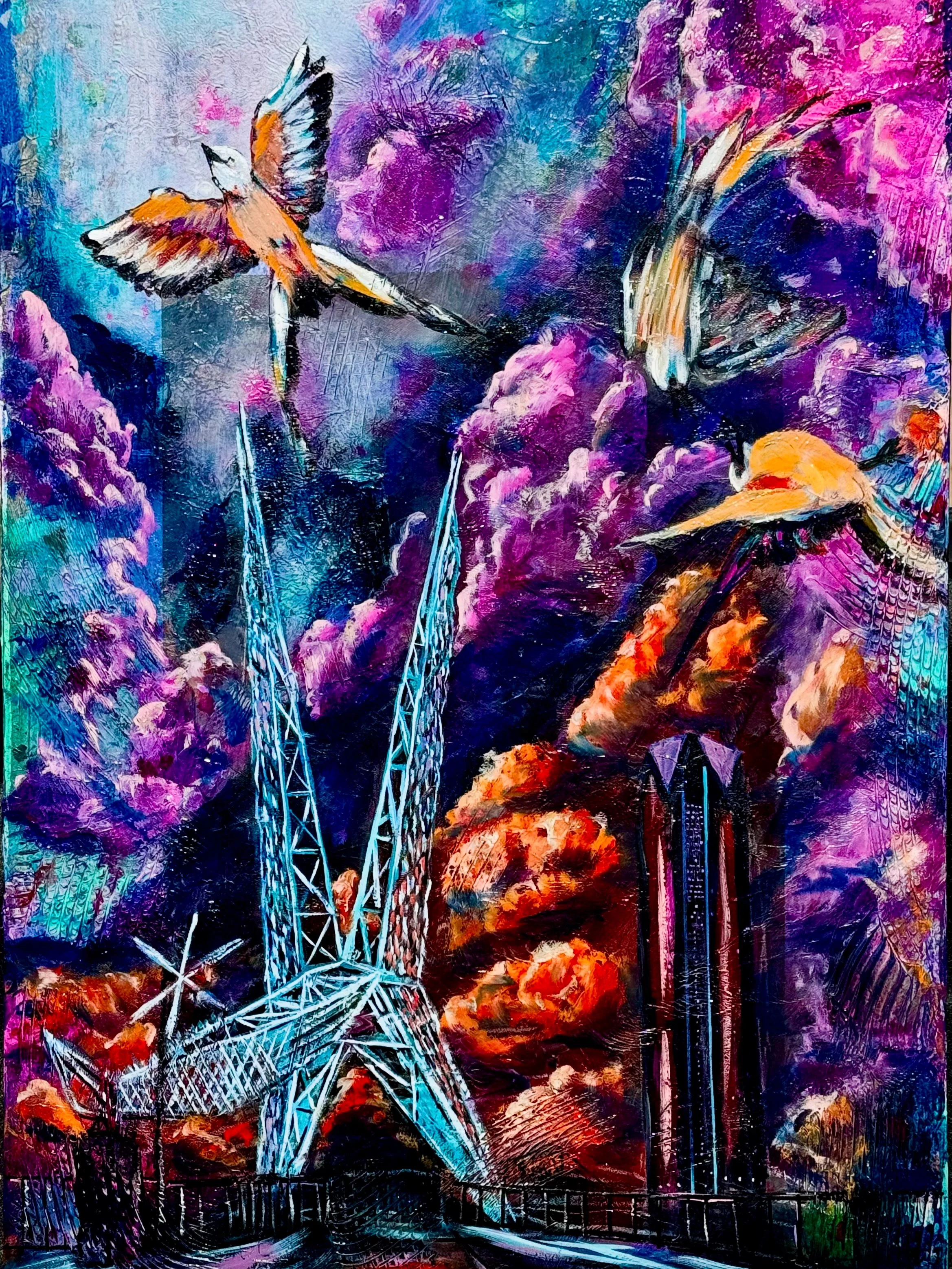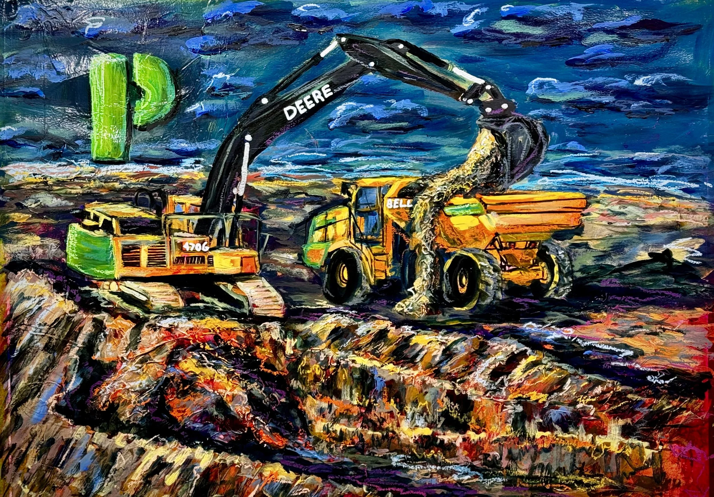 As someone who splits time between the art studio and the job site, my work is a unique blend of the natural world and the industrial landscape. My canvases often feature florals and wildlife, cityscapes bustling with energy, and the towering presence of heavy equipment that shapes our world. Each piece tells a story of movement, resilience, and the beauty found in unexpected places.